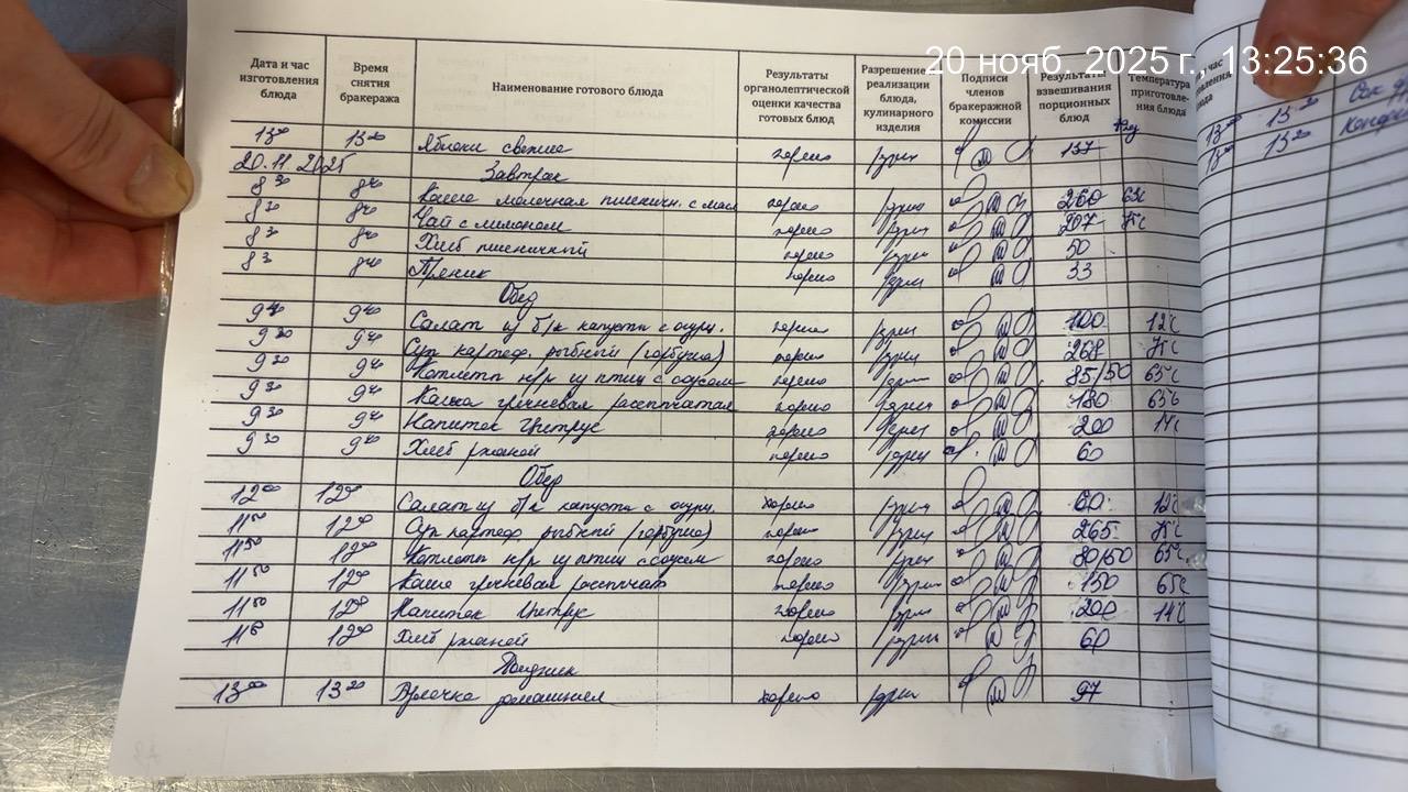 - Наличие записей в бракеражном журнале готовых блюд