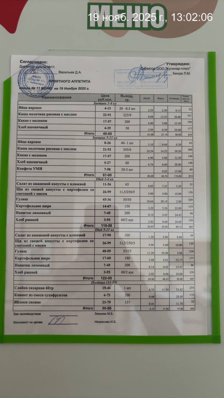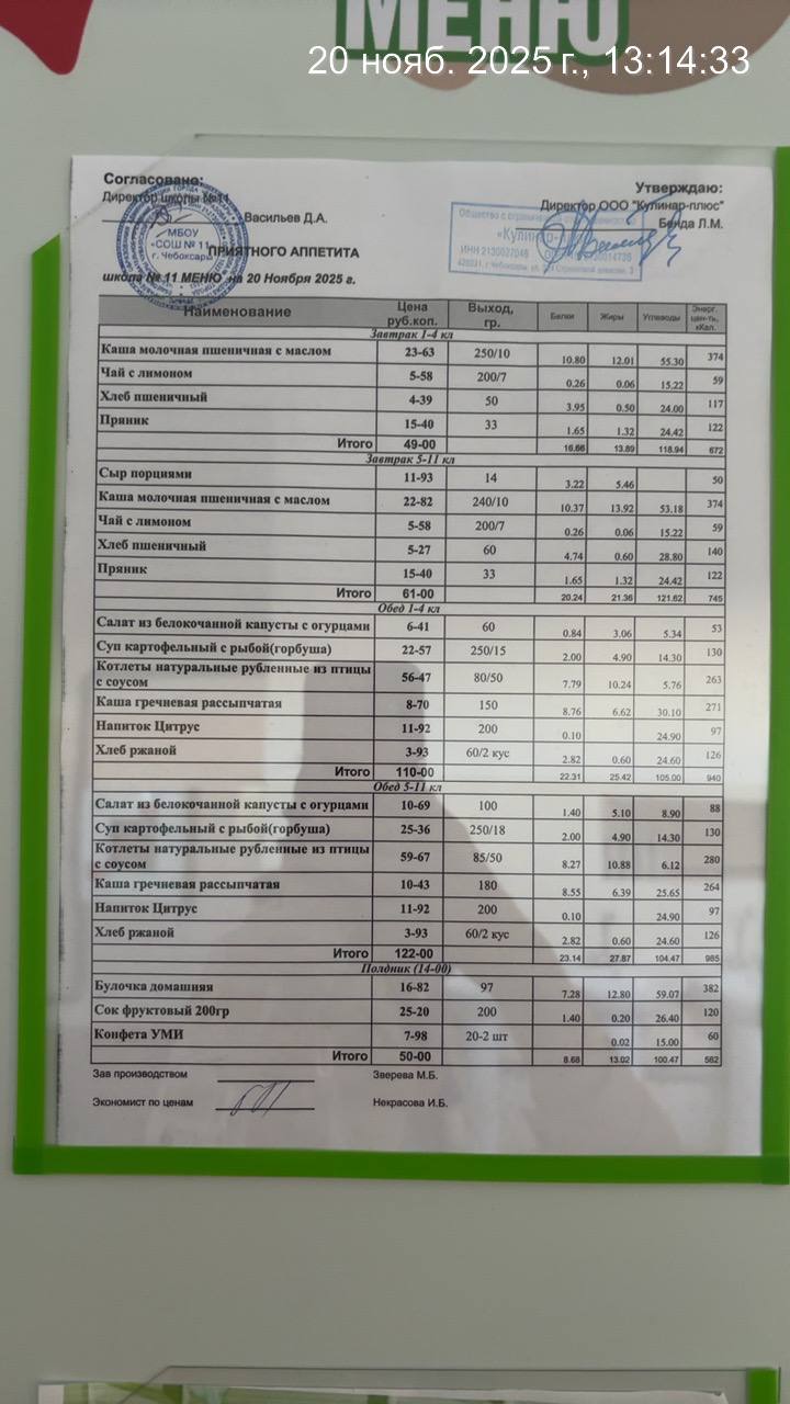 - Наличие информационного стенда с ежедневным меню