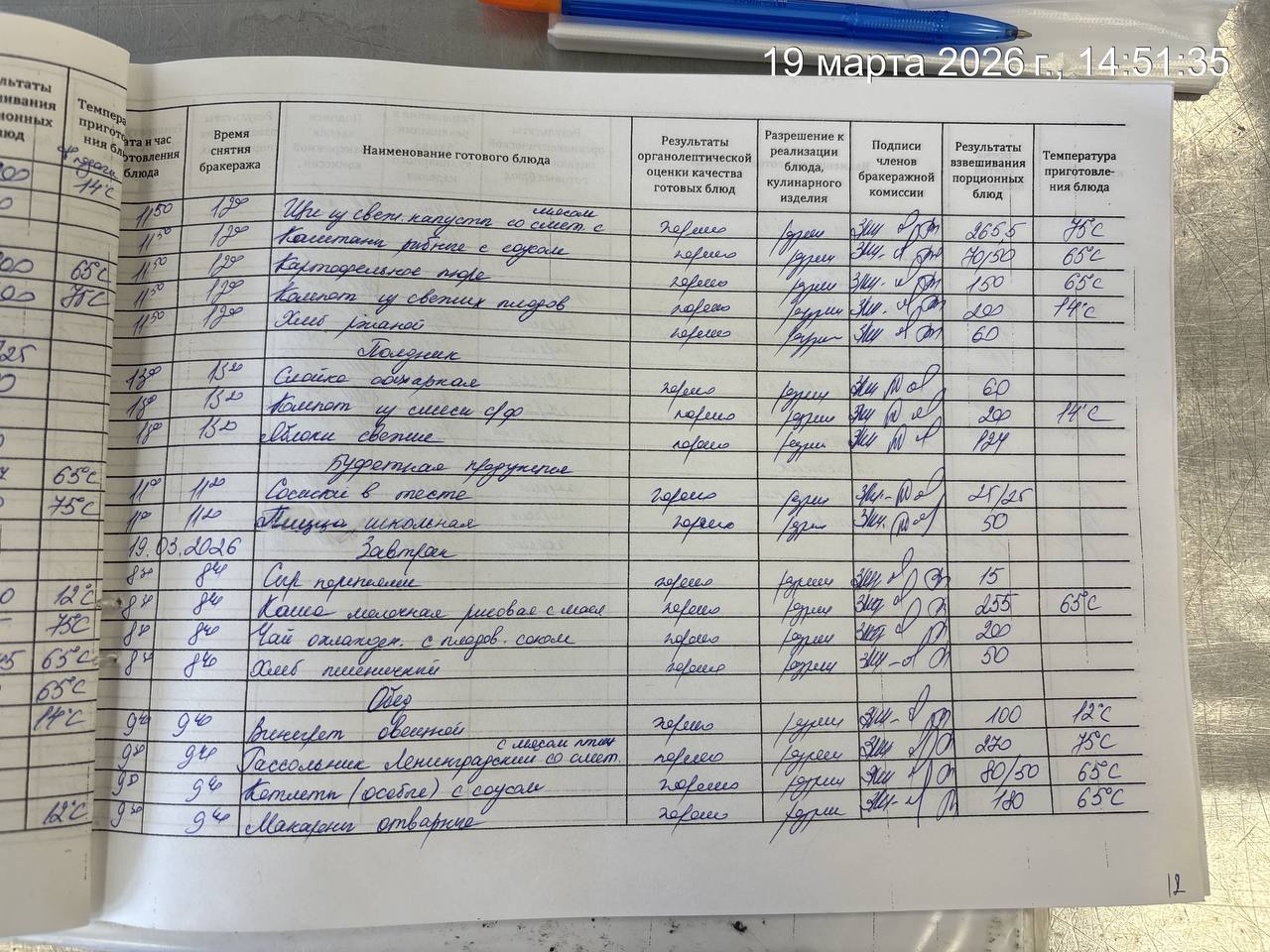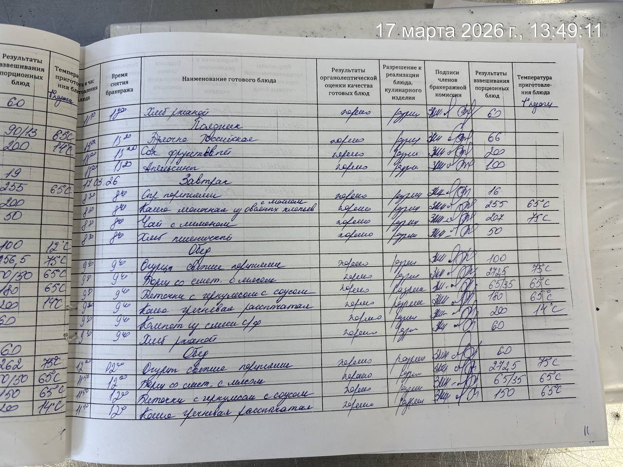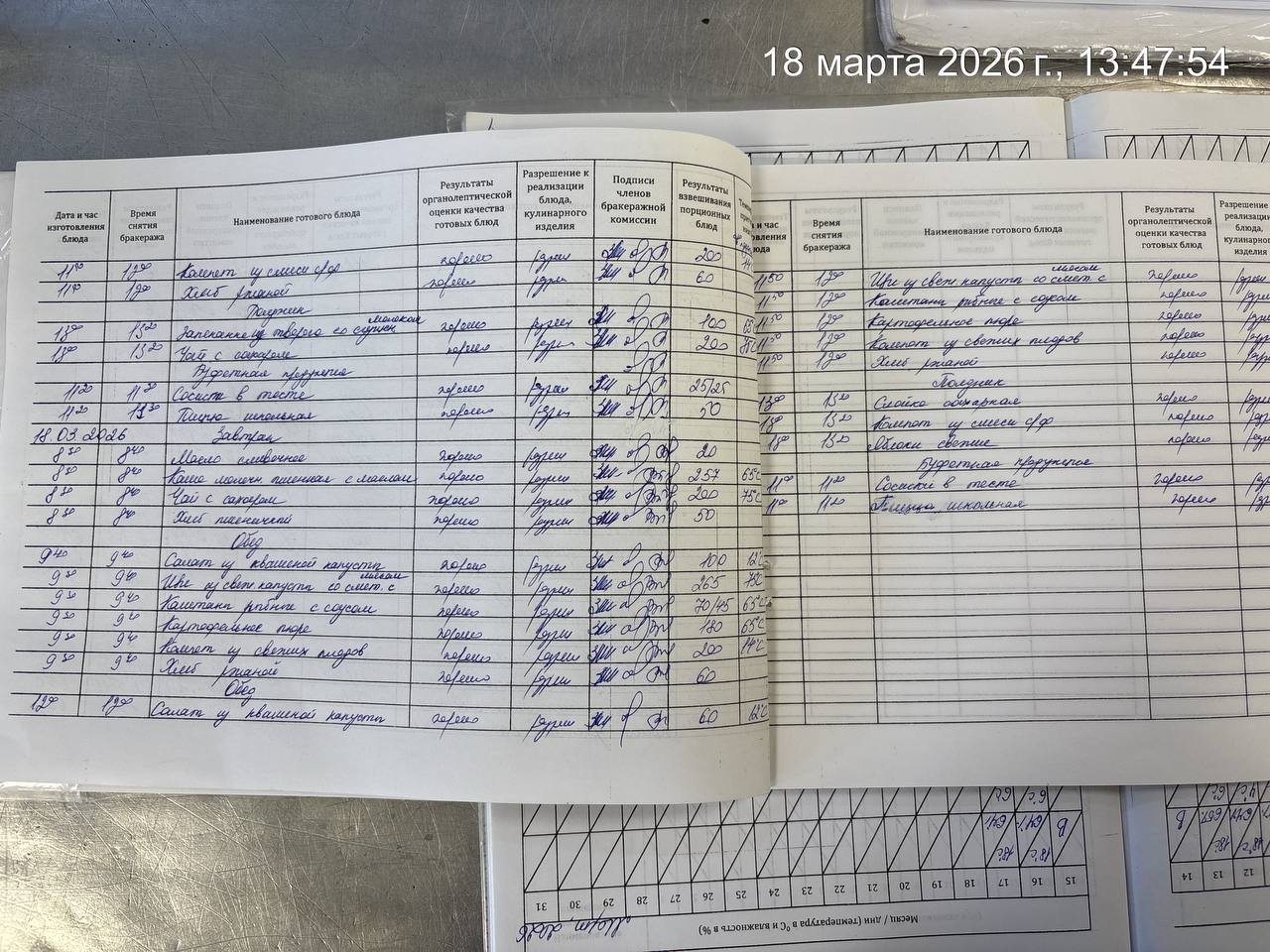 - Наличие записей в бракеражном журнале готовых блюд