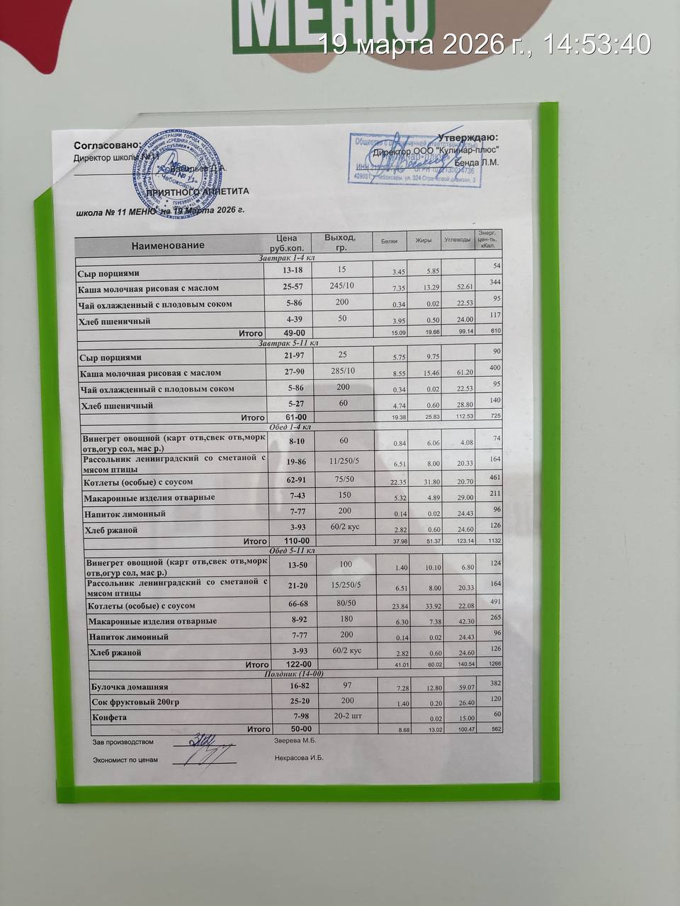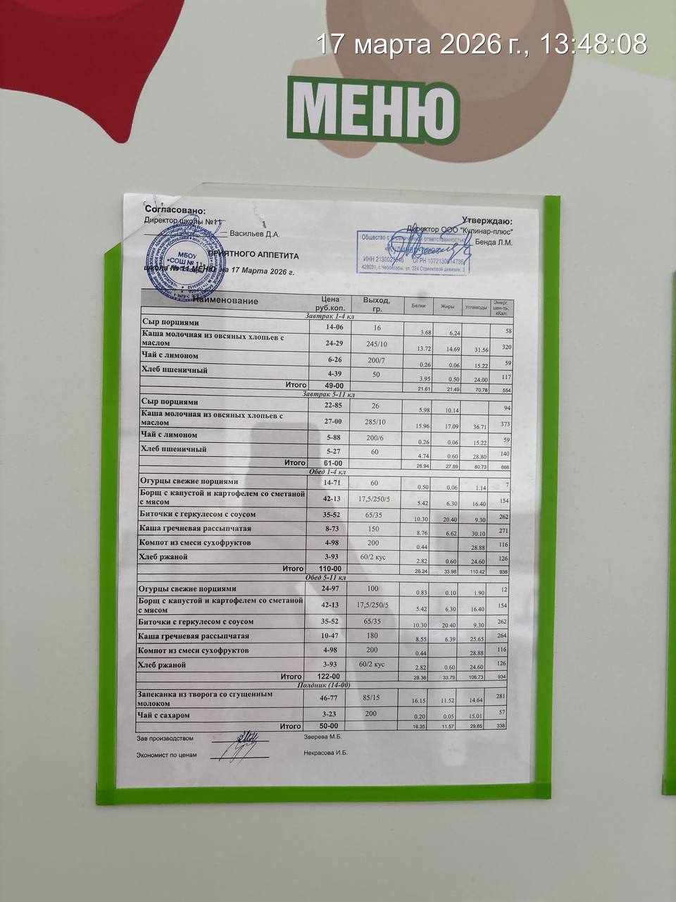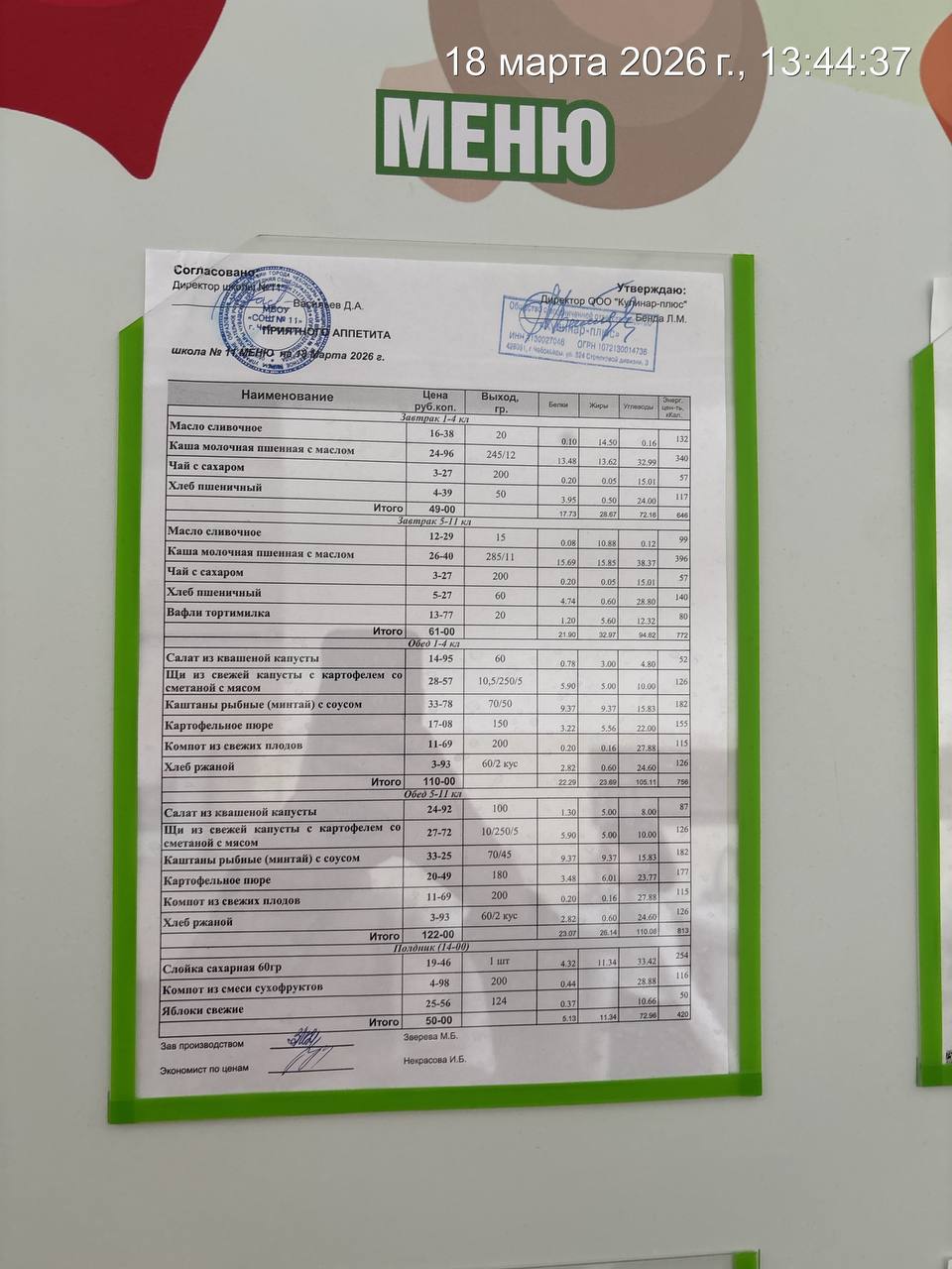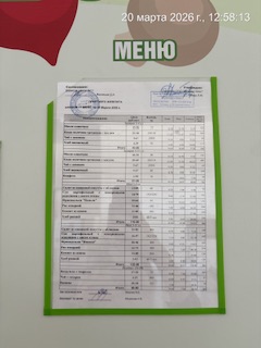 - Наличие информационного стенда с ежедневным меню