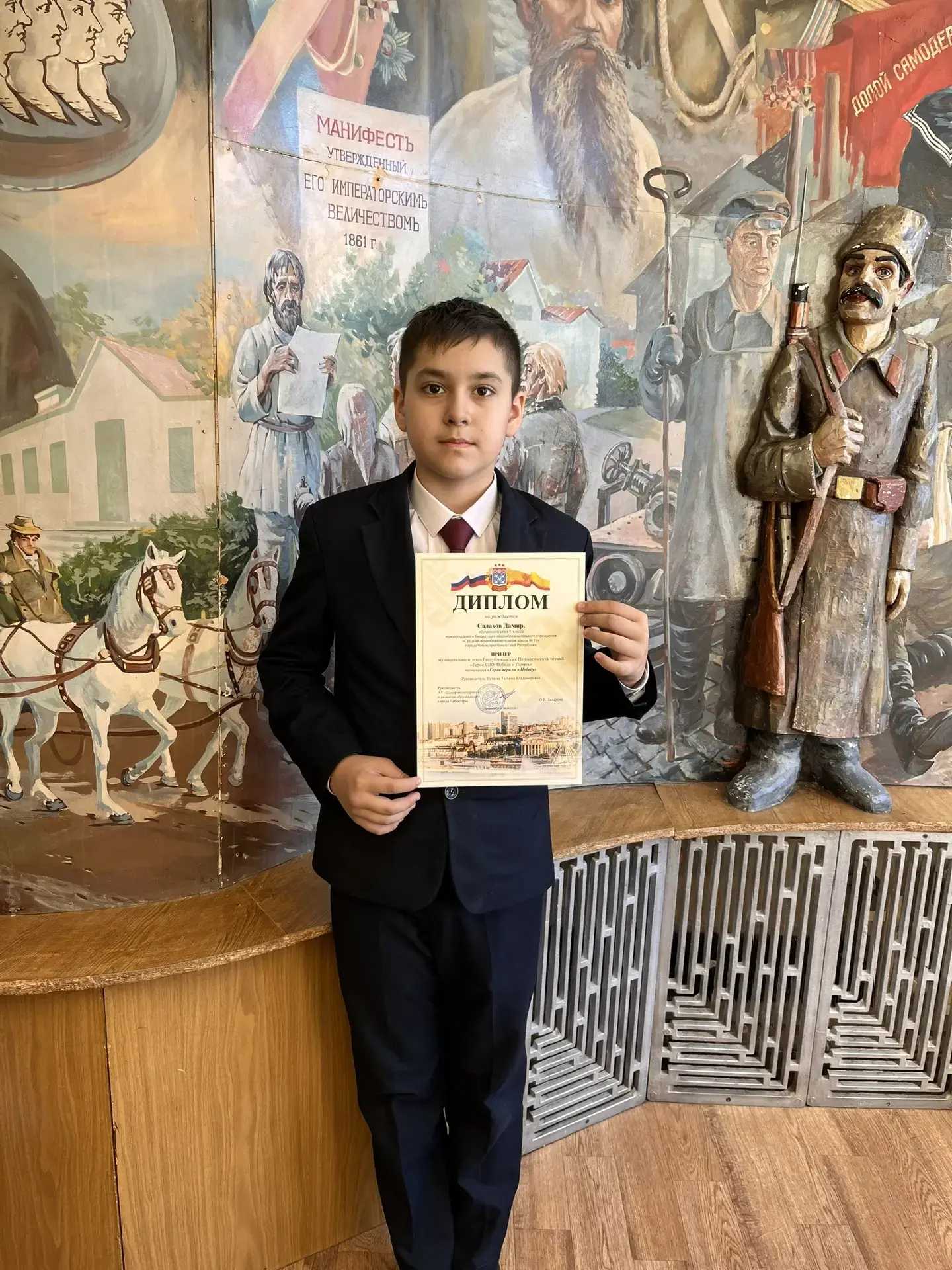 Ученик 5 класса Дамир С. принял участие и стал призером Муниципального этапа Республиканских Патриотических чтений «Герои СВО. Победа и Память» в номинации «Герои верили в Победу»( руководитель Гуляева Т.В.)