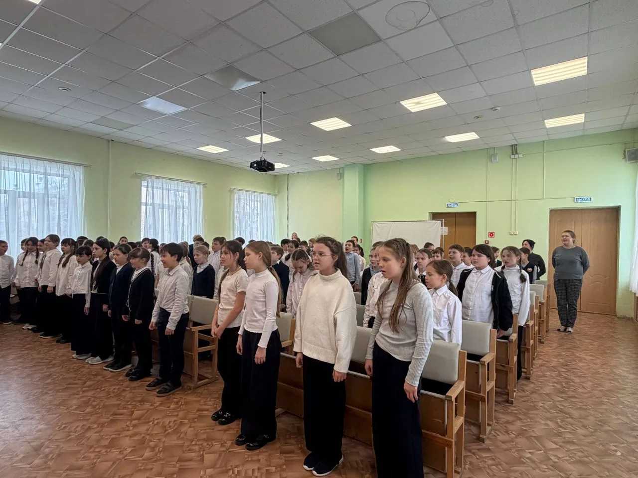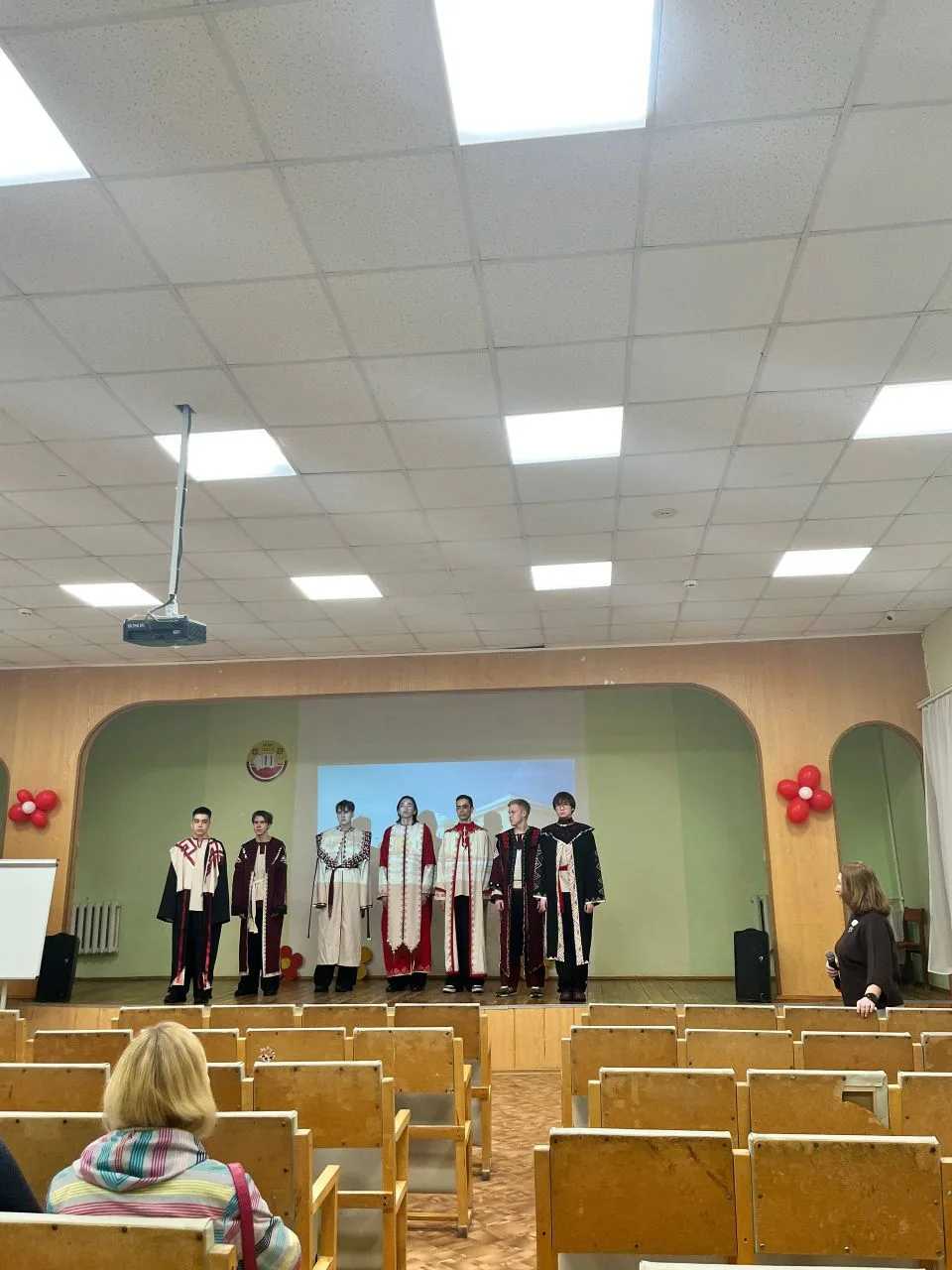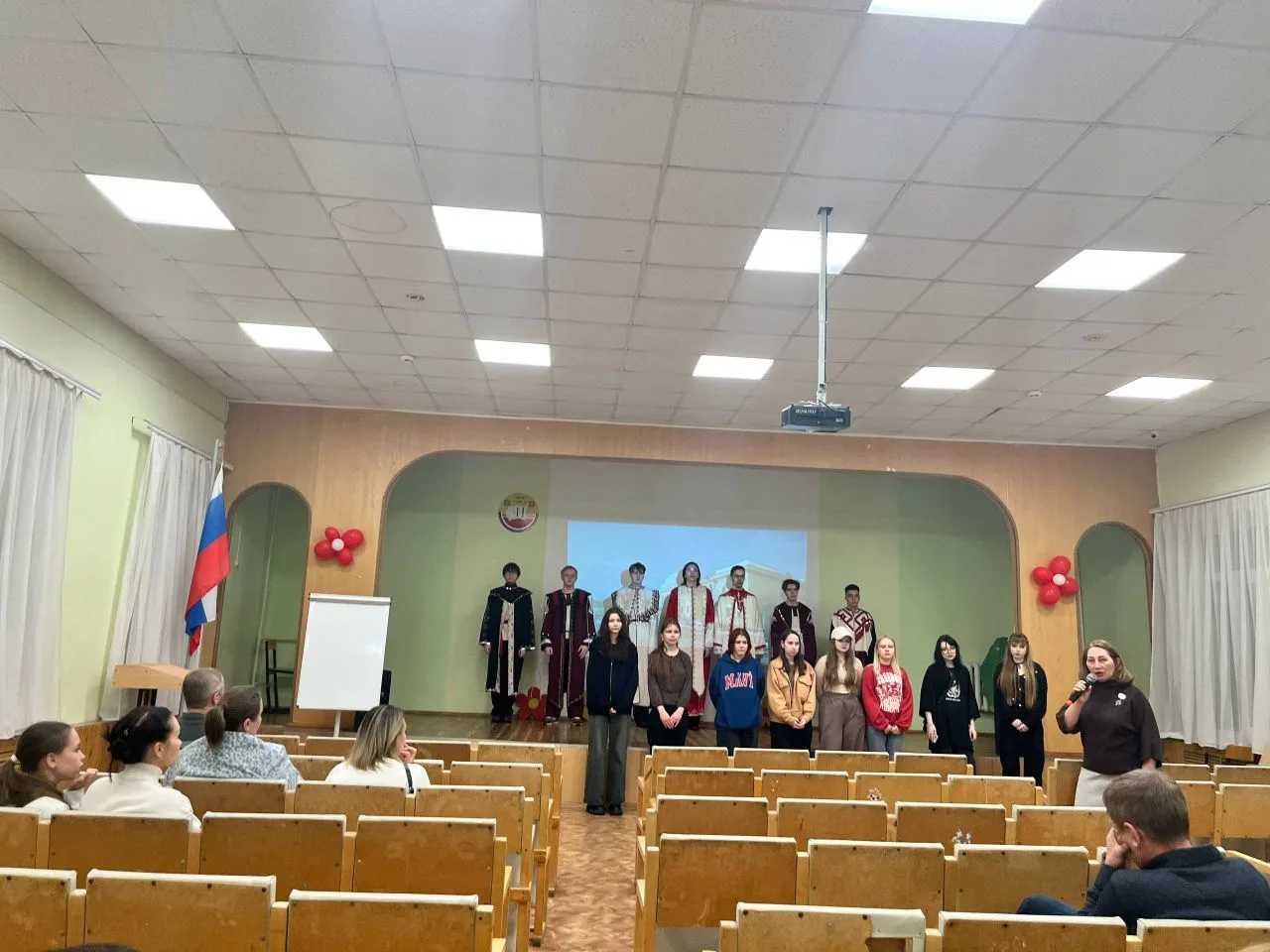 Все присутствующие прослушали гимны Российской Федерации и Чувашской Республики, подчеркивая важность уважения государственных символов и традиций. Заместитель директора по воспитательной работе поздравила участников и отметила значимость проведенных конкурсов и соревнований.