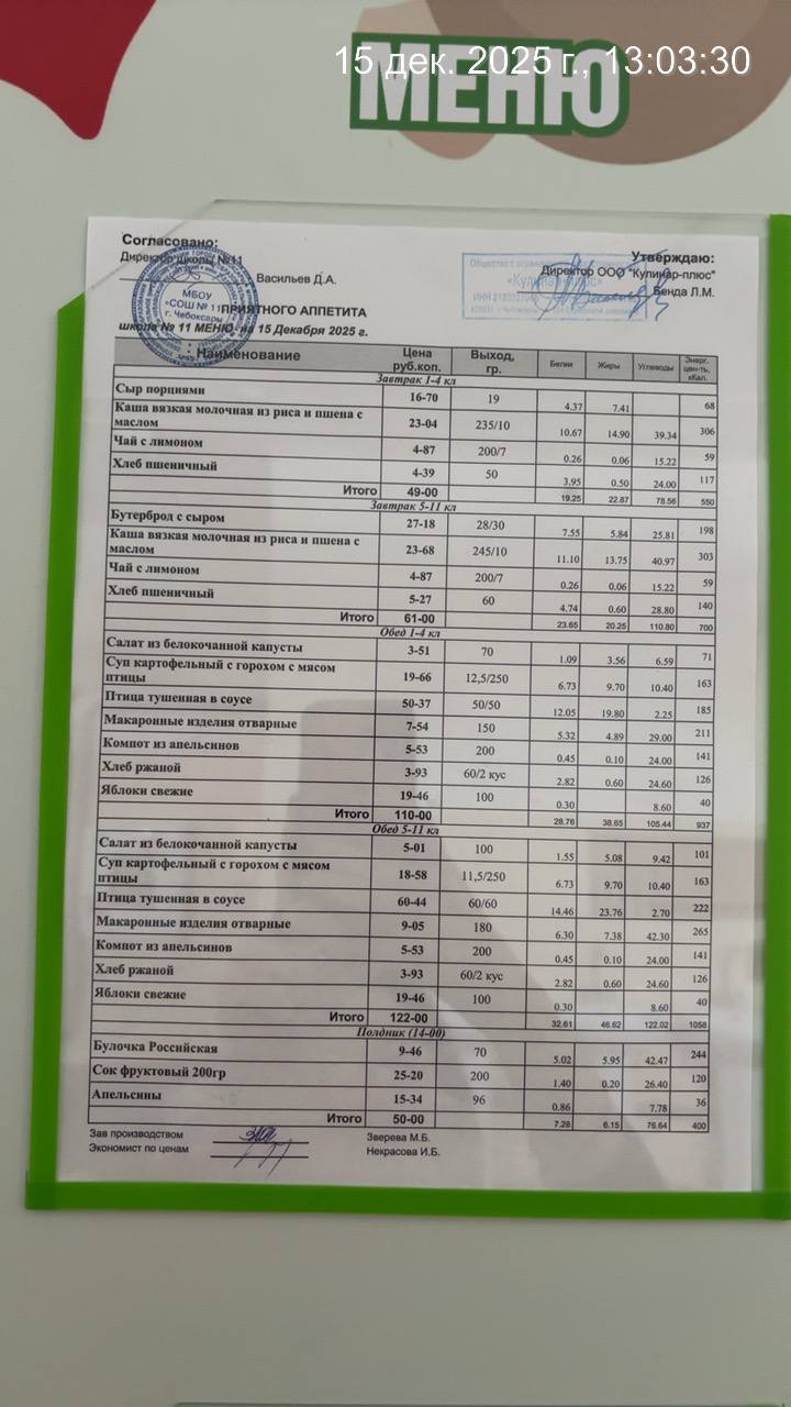 - Наличие информационного стенда с ежедневным меню