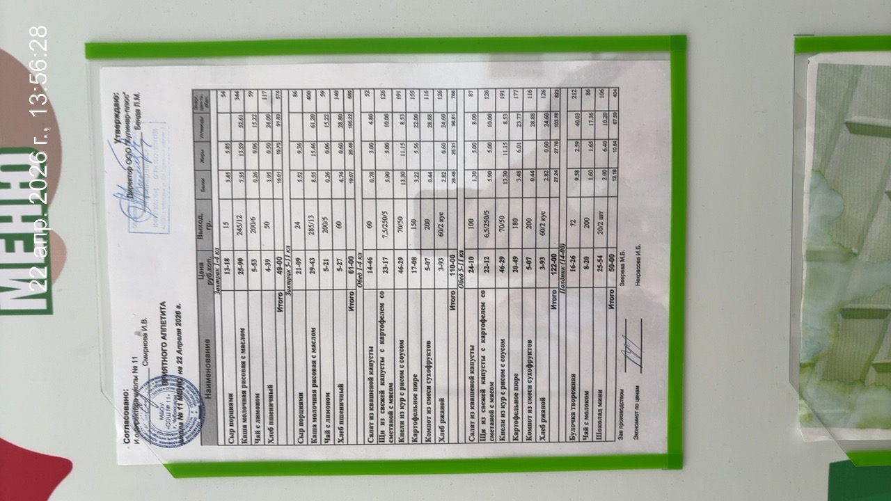 - Наличие информационного стенда с ежедневным меню