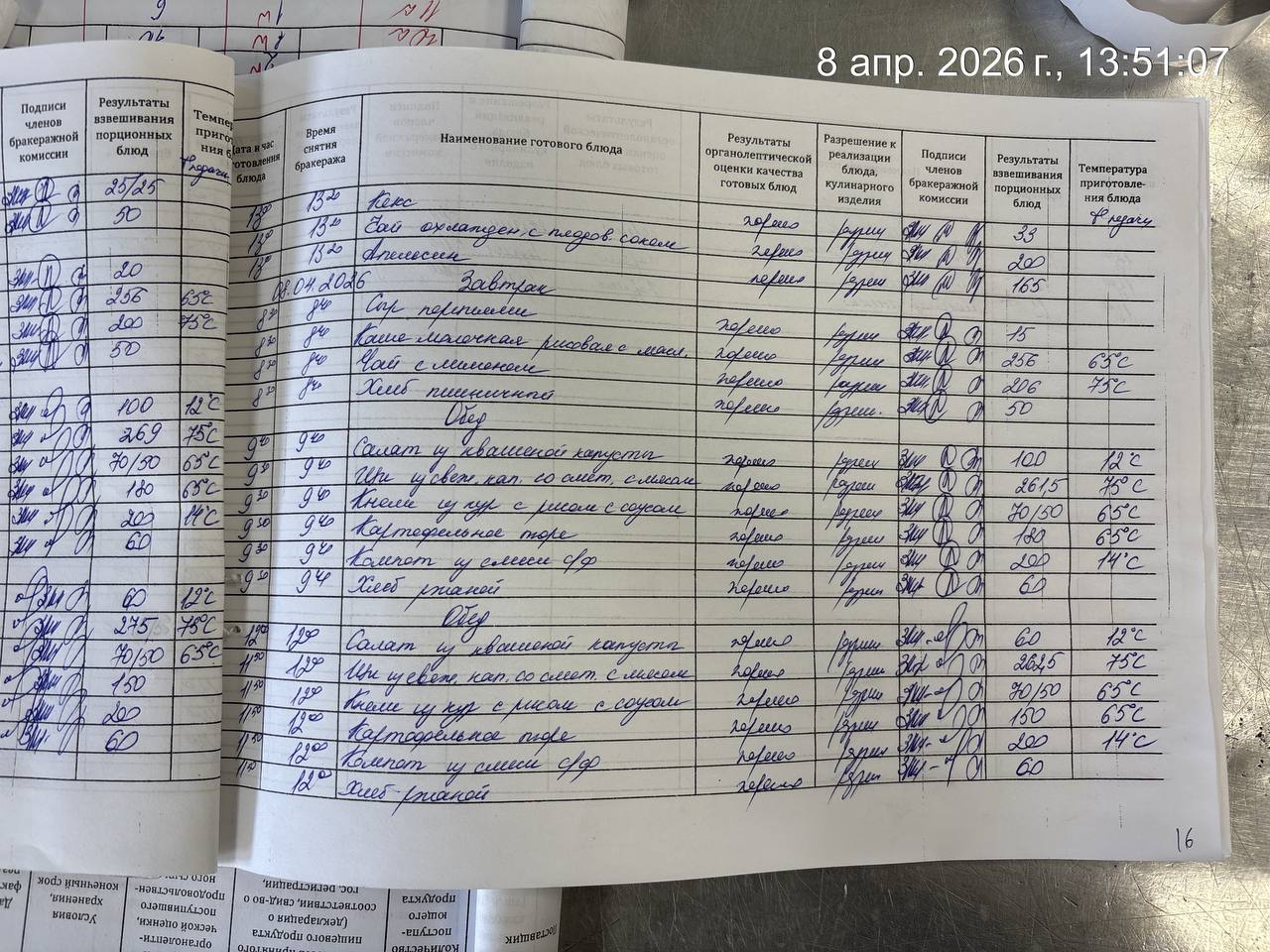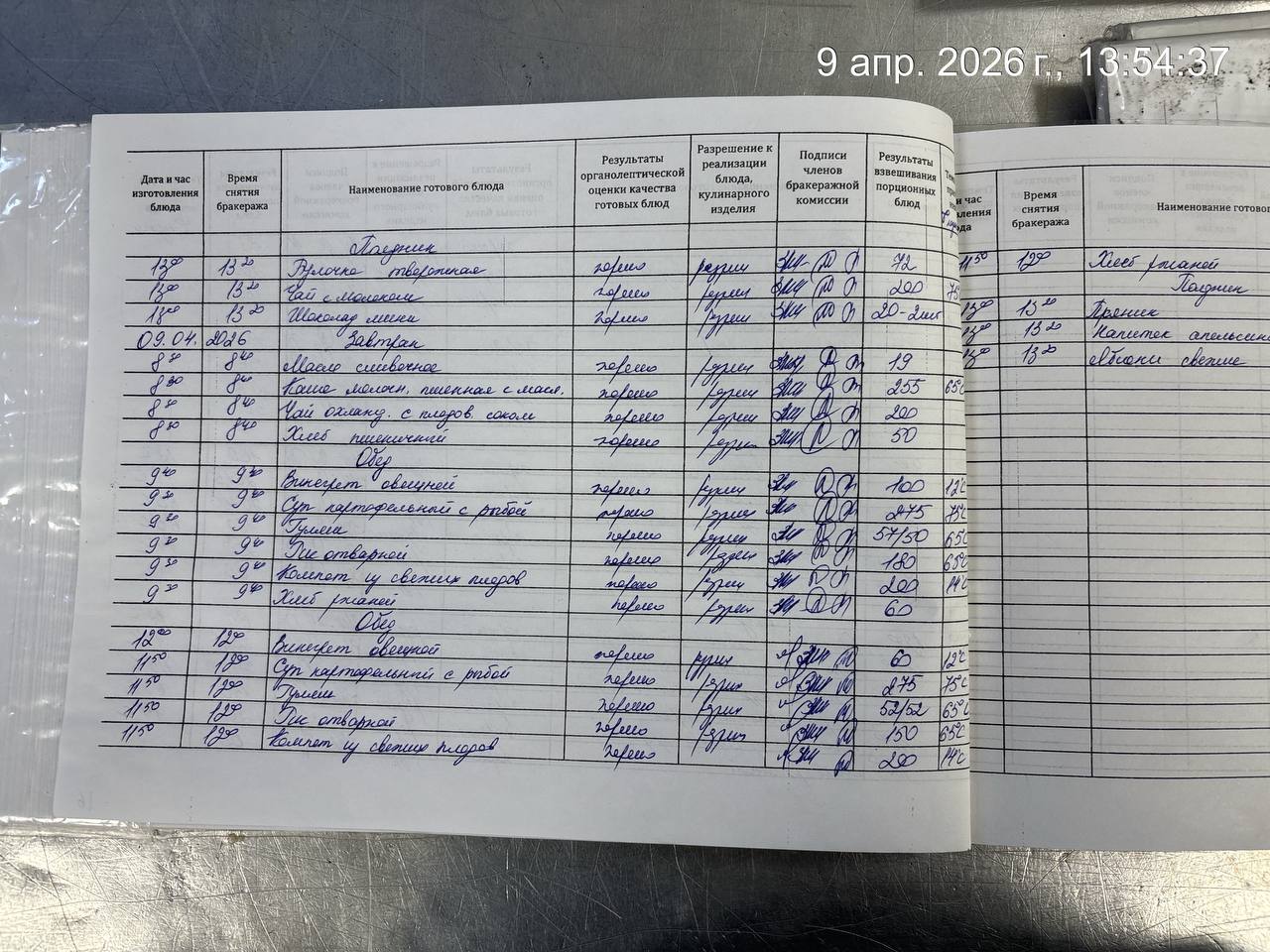 - Наличие записей в бракеражном журнале готовых блюд