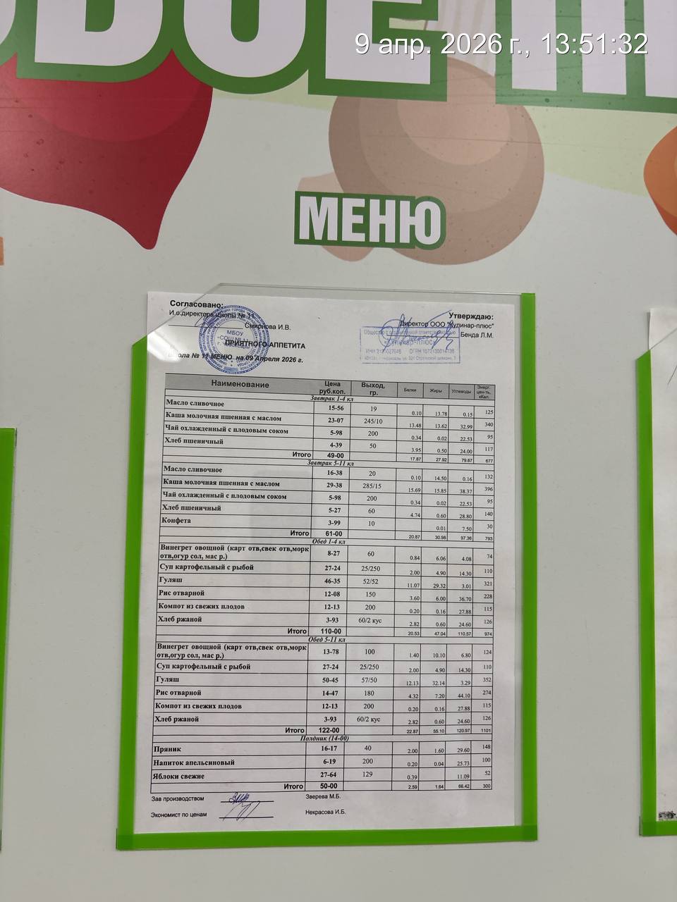 - Наличие информационного стенда с ежедневным меню