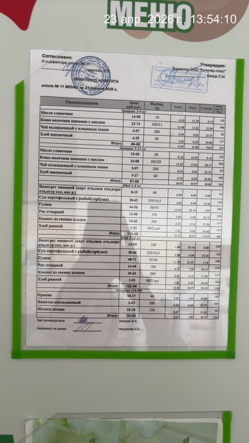 • Наличие информационного стенда с ежедневным меню